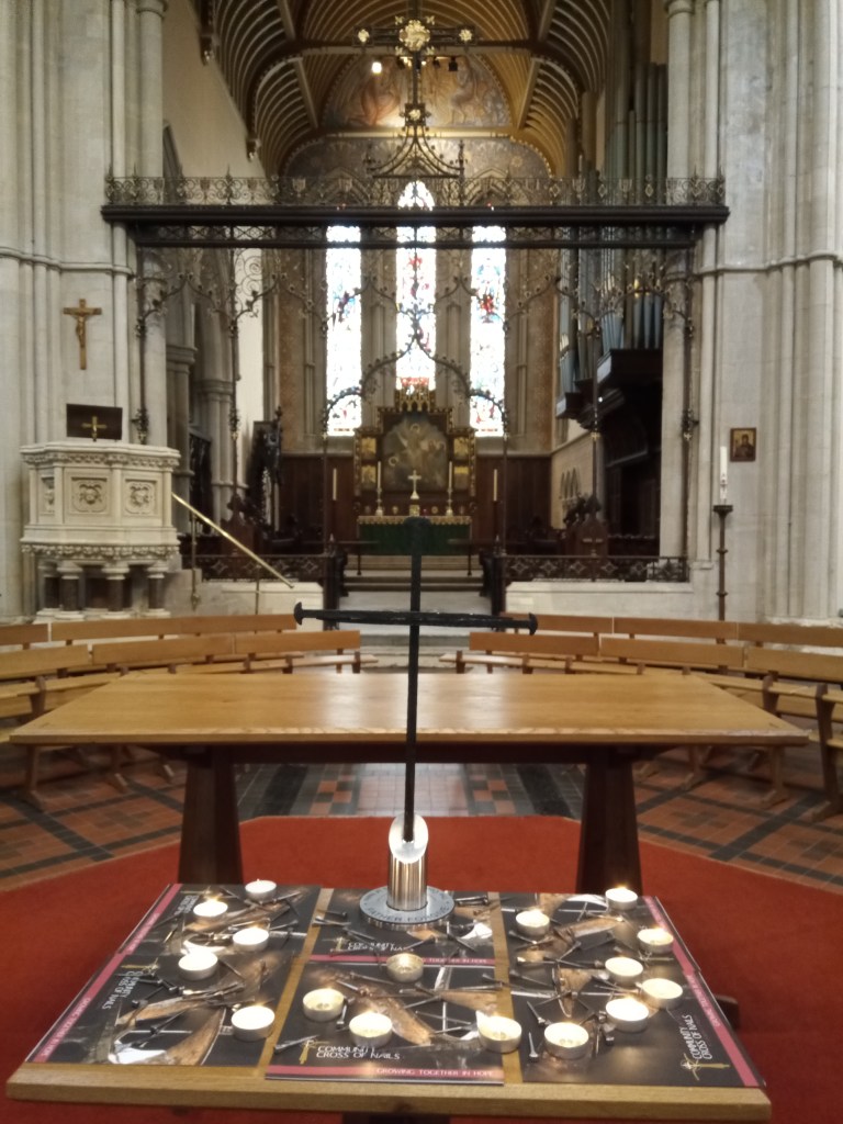 In joining the CCN movement TSSF were given a Cross of Nails, a replica of the cross fashioned from three medieval nails by local priest, the Revd Arthur Wales, to use during its international work. In the 800th Year of the existence of TSSF we are sharing this cross by taking it to all our various Area on of which is Scotland and Ireland. After the 800th year Celebrations in the UK, Scotland received the Cross and we agreed to take this cross in celebration around the region. The cross has been to Glasgow and Inverness Cathedrals, to the Gordon Church in Fochabers, to Aberchirder. At Inverness, The Primus, Bishop Mark Strange, spoke of the need for peace in our world and recalled the sense of comfort he himself had experienced a few years ago when, after a particularly stressful experience at an Israeli military checkpoint, he sat by the Cross of Nails in the Tantour Ecumenical Institute in Jerusalem. We then moved on to Saint John’s, Lothian Road in Edinburgh where the service was streamed to Ireland for members and Tertiaries there, and finally to Saint John’s here in Dumfries where several members shared a service of reconciliation in regular Tuesday and Wednesday Eucharistic celebrations alongside local members of TSSF.